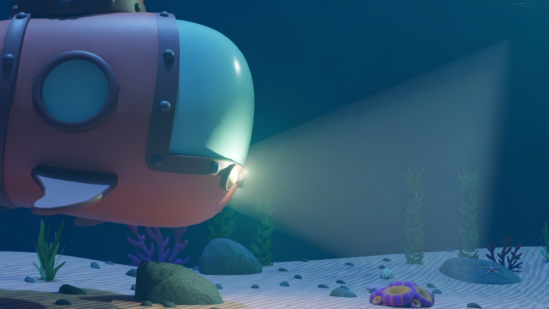 It was a challenge to coordinate between all of the people involved in the process, especially since many tasks were interdependent. Strong leadership, clear communication, and clear organization helped us stay on track and work well together. My main roll included modeling and animating the submarine plus rendering backgrounds for scenes that involved the sub interior.